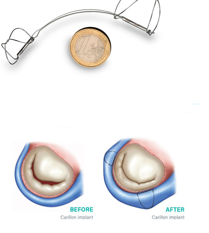 Das Carillon Mitral Contour System ist eine minimal-invasive Behandlungsoption, die speziell für die Behandlung von FMI entwickelt wurde. Das Carillon-Implantat wird unter Verwendung einer nicht-chirurgischen, minimal invasiven (katheterbasierten) Technik in einer Vene an der Außenseite des Herzens, die an die Mitralklappe angrenzt, platziert. Diese einfache Prozedur wurde entwickelt, um die Mitralklappe umzuformen, die Undichtigkeit der Klappe zu verringern und somit die Mitralinsuffizienz zu verringern.